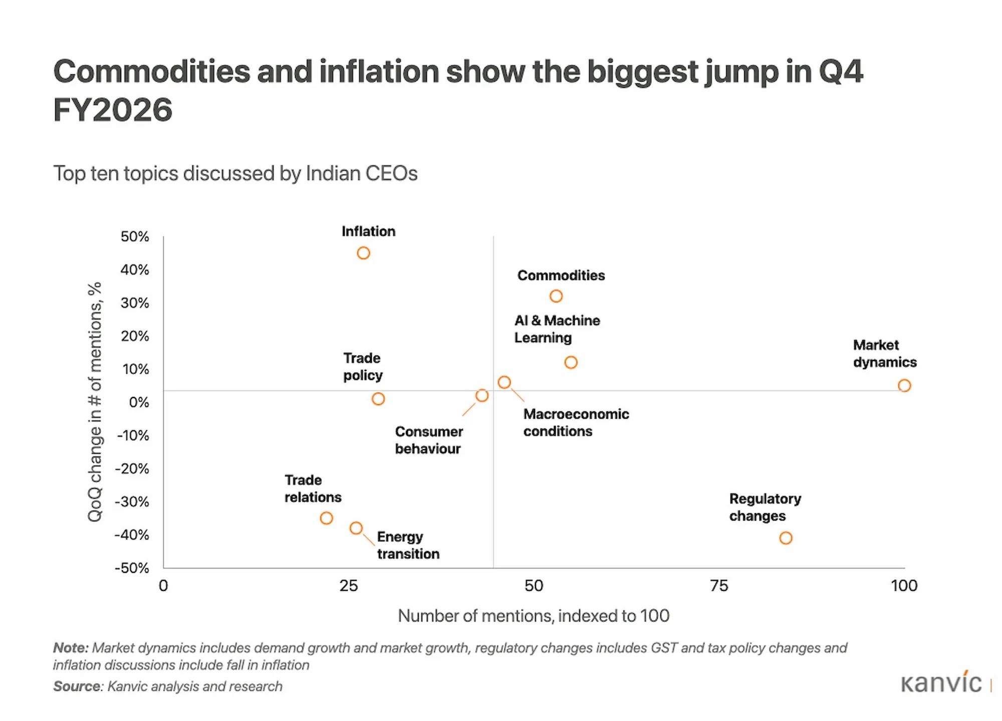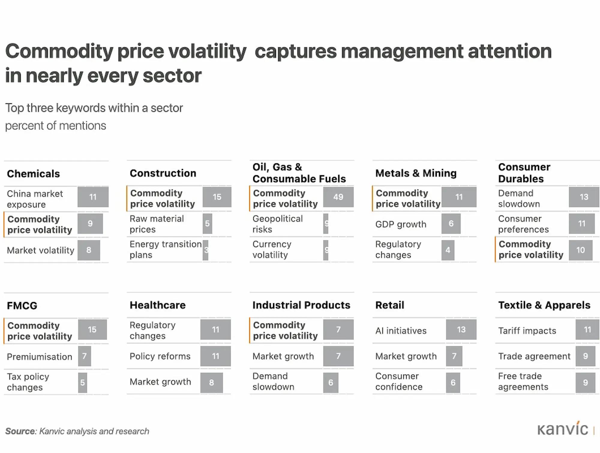 Trade policy and geopolitical risk have become permanent features of the CEO agenda. While trade policy mentions remain steady (+1% QoQ), the underlying conversation has become more nuanced and sector-specific. In textiles and apparel, tariff impacts and trade agreements are the top keywords, reflecting the sector’s acute sensitivity to shifts in global trade flows. In automotive and industrial products, supply chain challenges and import restrictions are driving a reassessment of sourcing and localisation strategies.